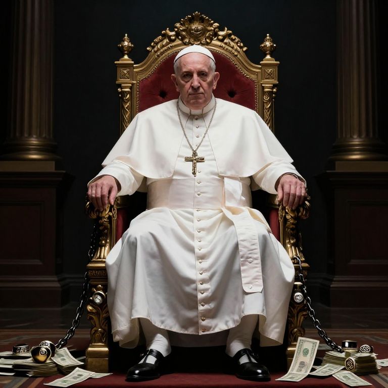 Photograph of an elderly white Catholic Pope seated on an ornate, gold throne with red velvet cushions. He wears a white cassock, matching skullcap, and a gold cross on a chain around his neck. His hands rest on the throne's armrests, which are chained. Scattered on the floor are dollar bills and a vintage camera. The background is dark, with tall, dark columns on either side. The Pope's expression is solemn and authoritative. The lighting highlights his white attire, creating a strong contrast against the dark background.