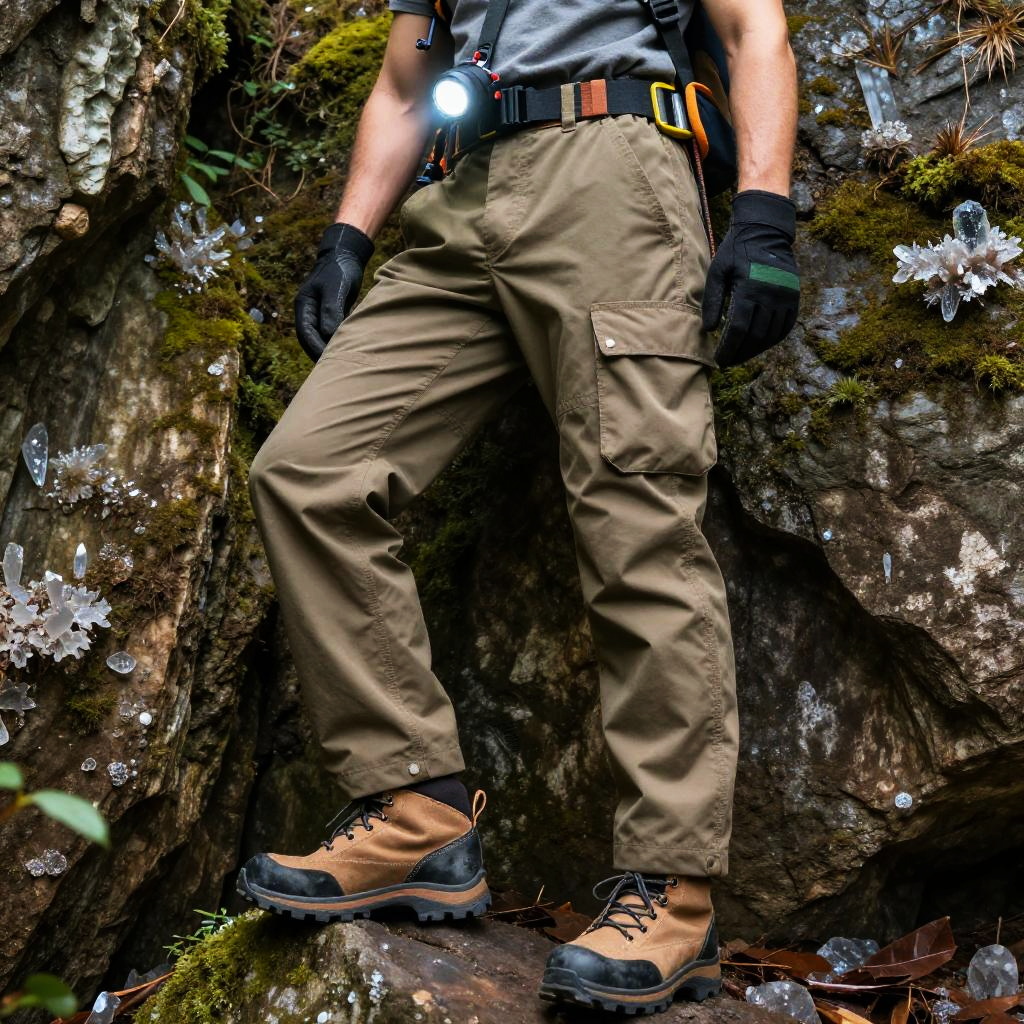 Spelunking outfit styled for adventure with multi-pocket pants, rugged boots, durable gloves, bright headlamp, while climbing slippery cave walls covered with moss and crystals