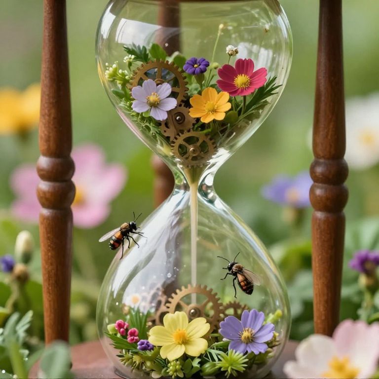 Depict an hourglass with a close-up view showcasing a lush, vibrant garden within its upper chamber. The scene is composed from various perspectives, revealing intricate clock gears and delicate flowers alongside insects in an enchanting fusion of nature and machinery. This surreal composition captures the essence of dreamlike fantasy by blending organic elements such as petals and leaves with mechanical components, evoking curiosity and wonder in viewers.