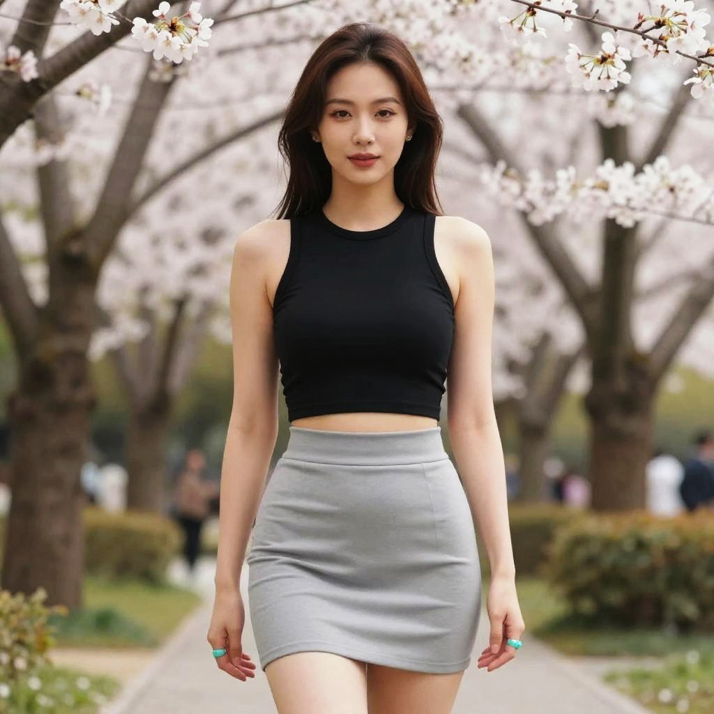 A woman in a black cropped tank top and high-waisted camouflage leggings stands at a scenic park with blooming flowers, bathed in the warm hues of a sunrise. Sexy. Pretty face and beutiful eyes
