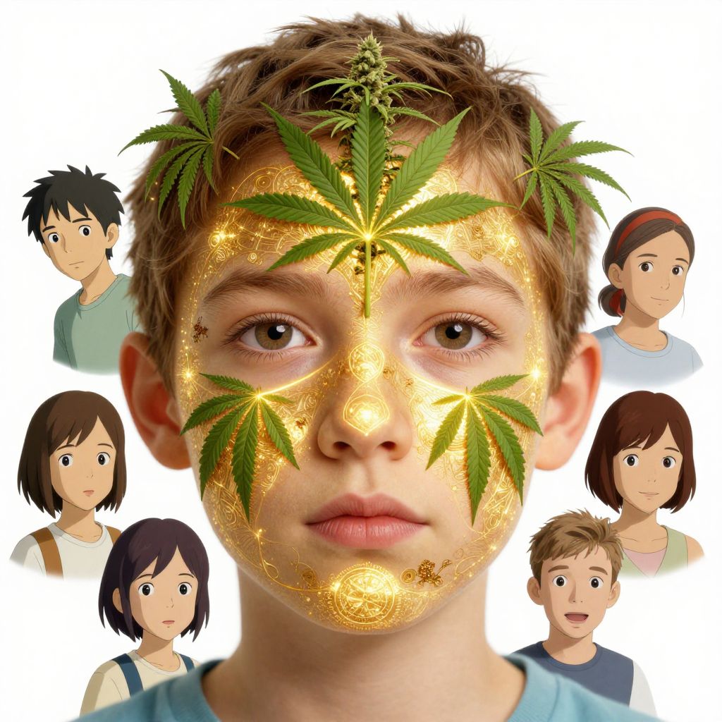 Cannabis! hemp! marijuana! kid face, behance hd by jesper ejsing, by rhads, makoto shinkai and lois van baarle, ilya kuvshinov, rossdraws global illumination, golden ratio, symmetrical beauty face