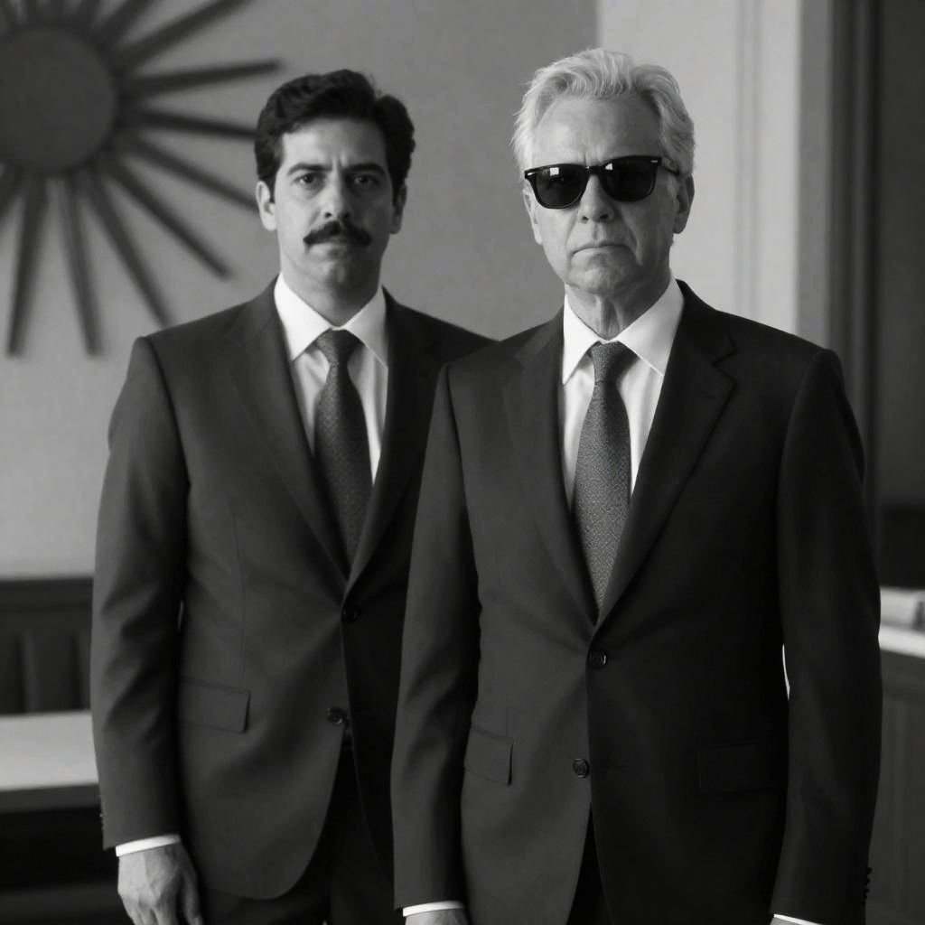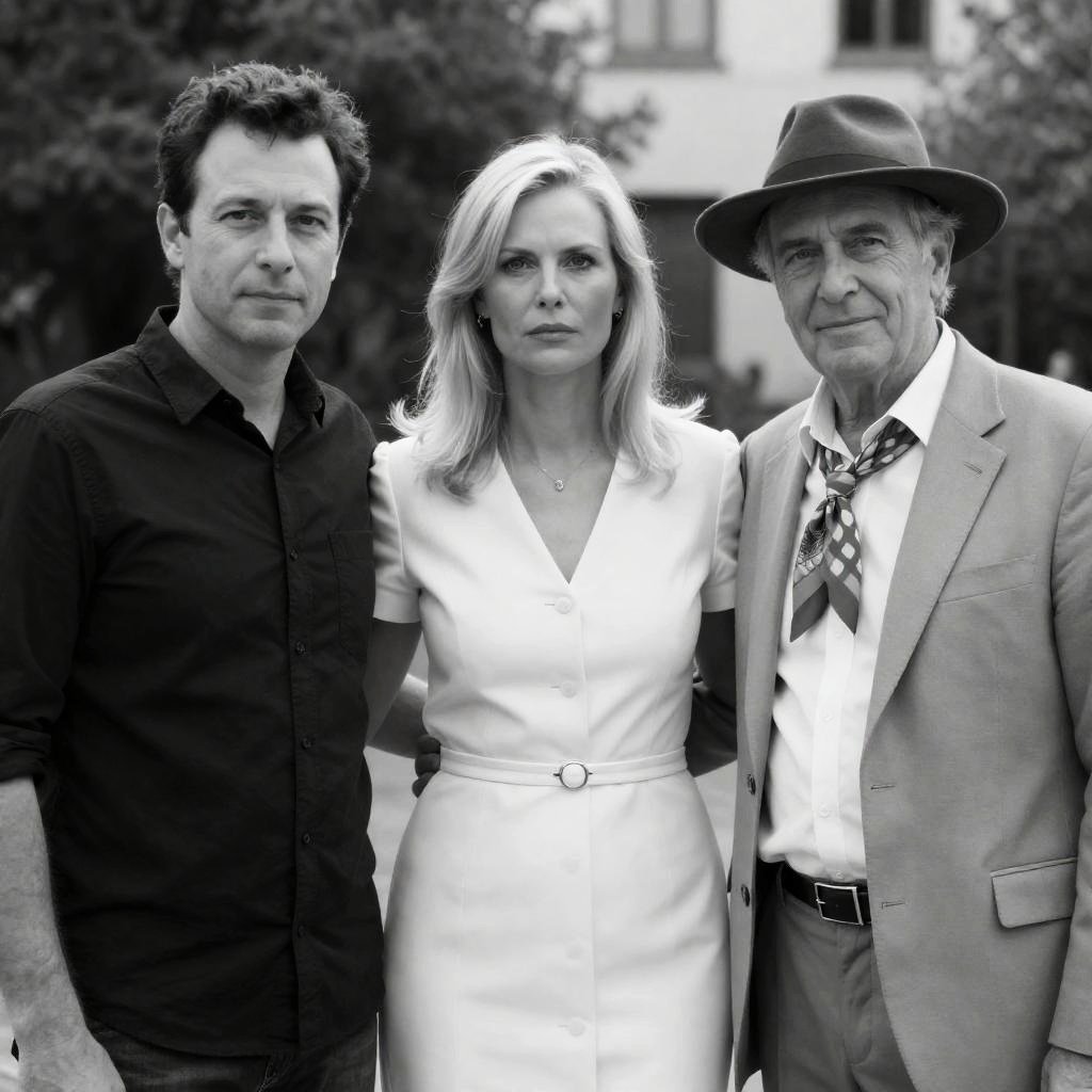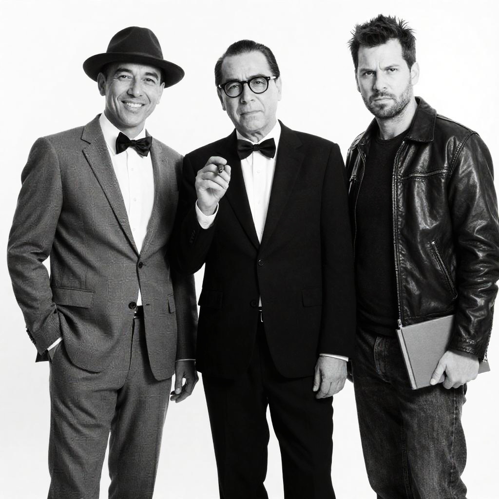 Black-and-white photograph of three men. First man in checkered suit, bow tie, and hat, smiling. Middle man in dark suit, bow tie, glasses, holding cigar. Third man in leather jacket, denim, holding book, intense expression. All standing, white background.