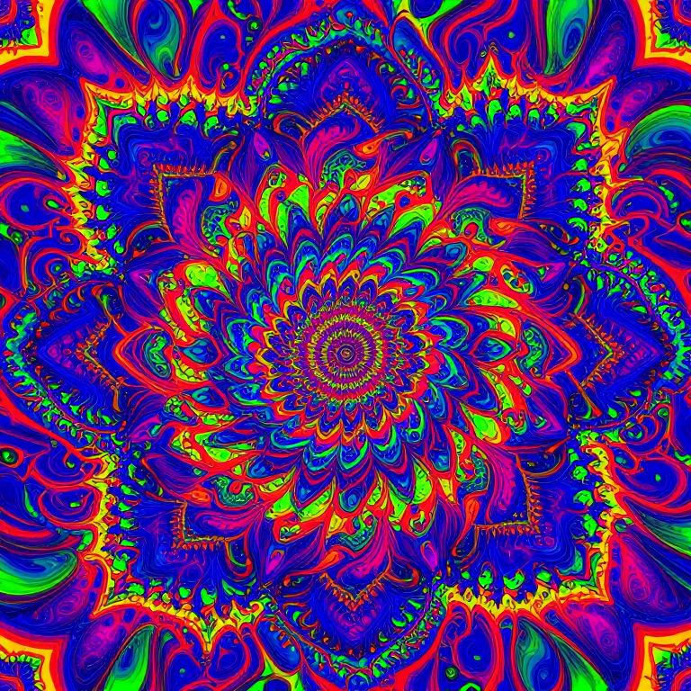 A vibrant, neon, psychedelic fractal scene with bold, ultra-bright colors and intricate patterns.