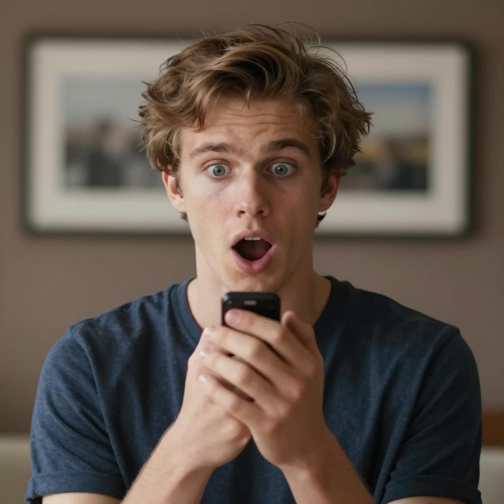 Young man with light brown, slightly messy hair, blue eyes, and an intense expression, mouth open in surprise. He holds a black object in his right hand, wearing a dark blue shirt. Background has blurred, framed picture on a brown wall.