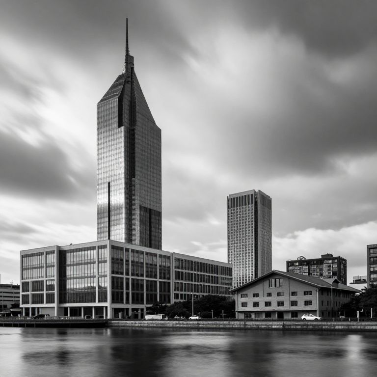 The image presents a striking black and white scene of a futuristic cityscape. Dominating the foreground is a tall, angular building with a pointed top, reflecting in the calm water below. Adjacent to it is a modern, rectangular structure with large windows, while a smaller, more traditional building with a curved roof sits nearby. In the background, a towering skyscraper rises, its facade adorned with numerous windows. The sky is dramatic, with swirling clouds and a bright light source creating a dynamic contrast. A lone car is parked in the foreground, adding a sense of scale to the scene. The overall composition is balanced, with elements arranged in a way that draws the viewer's eye across the image, from the foreground to the distant skyscraper.
