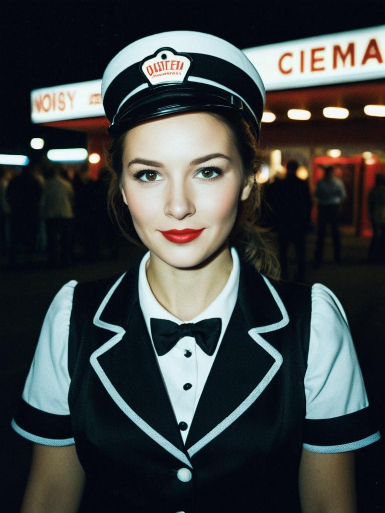 Woman in Cinema Usherette Costume, photorealistic outdoor portrait at night