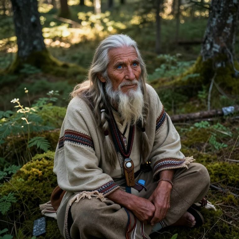 Photograph of an elderly Caucasian man with long, white hair and a full white beard, sitting cross-legged in a forest. He wears a beige, fringed, traditional Native American-style shirt with brown and black intricate patterns, and brown pants. His skin is weathered, and he has a thoughtful expression. The forest background is lush with green moss, ferns, and sunlight filtering through the trees, creating a serene, natural atmosphere. The man's shirt has a leather cord with a circular pendant around his neck. The image is richly detailed with vibrant colors and textures.