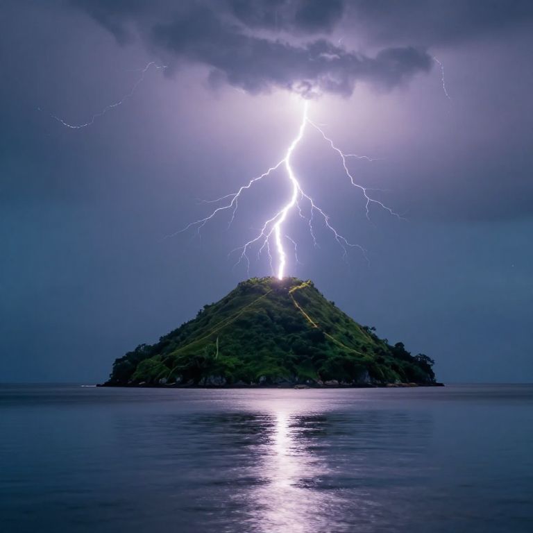 A solitary, verdant pyramid-shaped island floats serenely above a calm, reflective sea, illuminated by a dramatic bolt of lightning that forks outward, casting an ethereal glow and mirroring its radiant energy in the tranquil waters below.