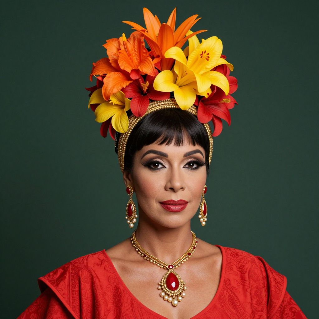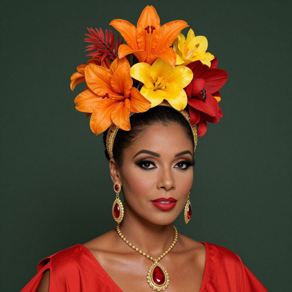 Carmen Miranda-inspired tropical OTT headdress featuring vibrant orange, yellow, and red flowers intricately arranged atop a golden headpiece, complemented by dangling earrings and a matching necklace, worn by a woman dressed in a bold red outfit against a dark green backdrop.