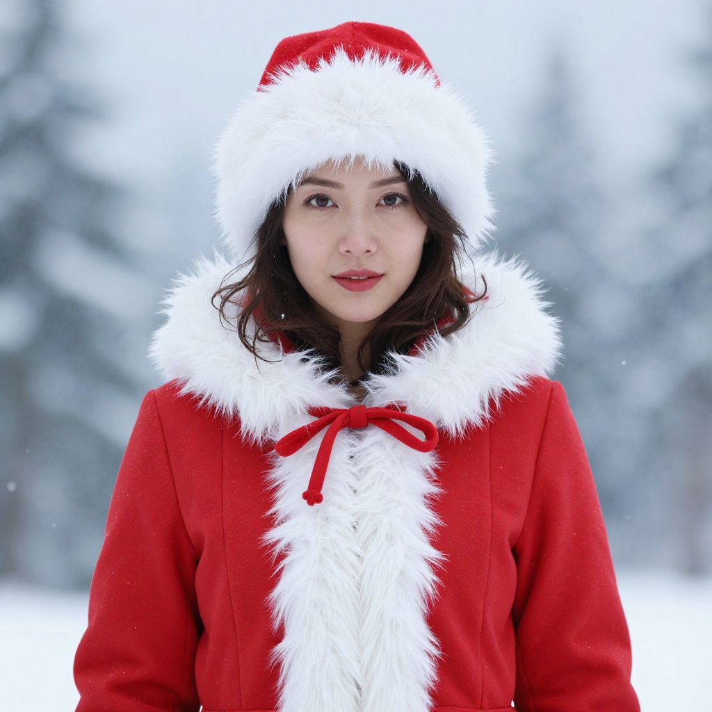 Winter Wonderland Costume Adult, woman in red coat and hat with white fur trim