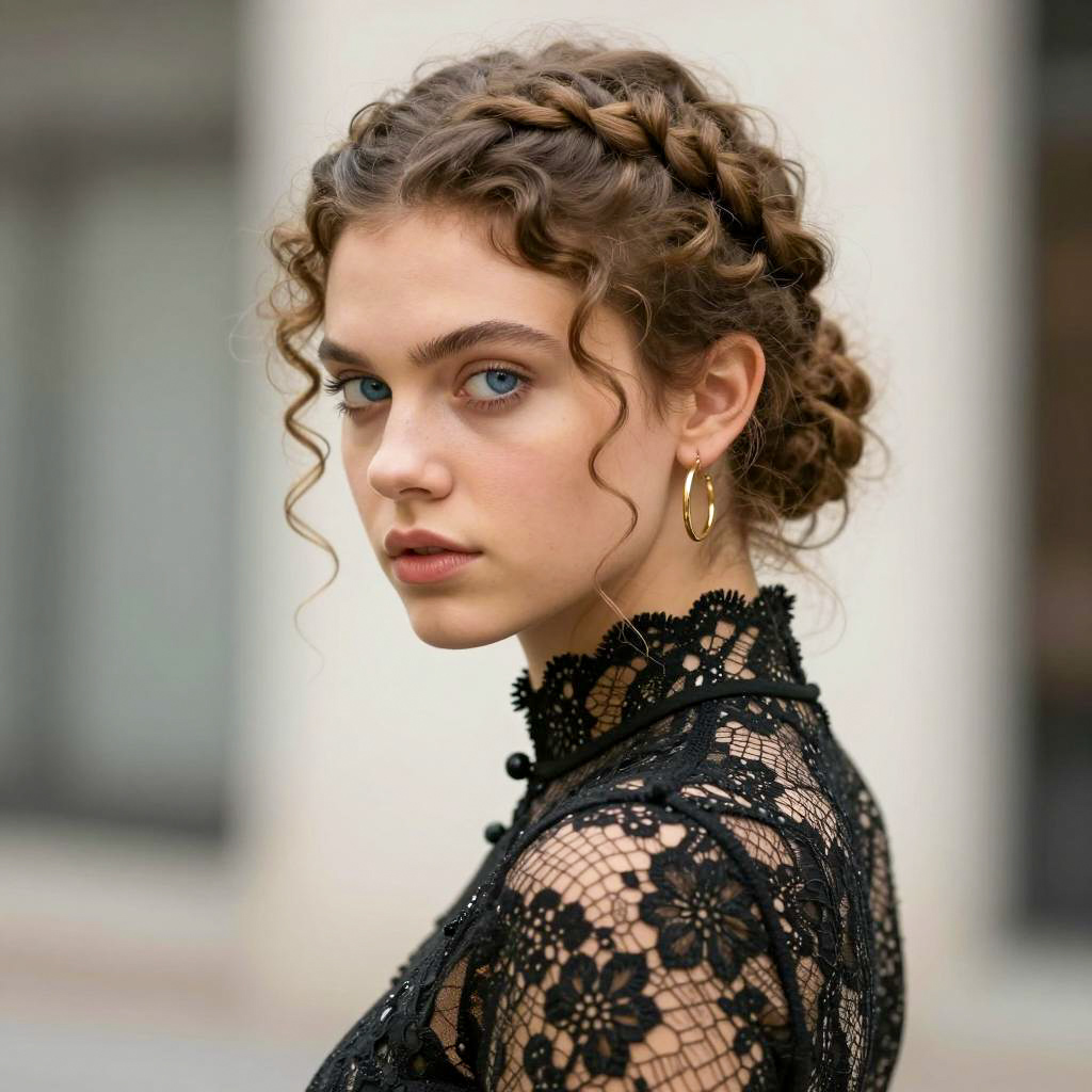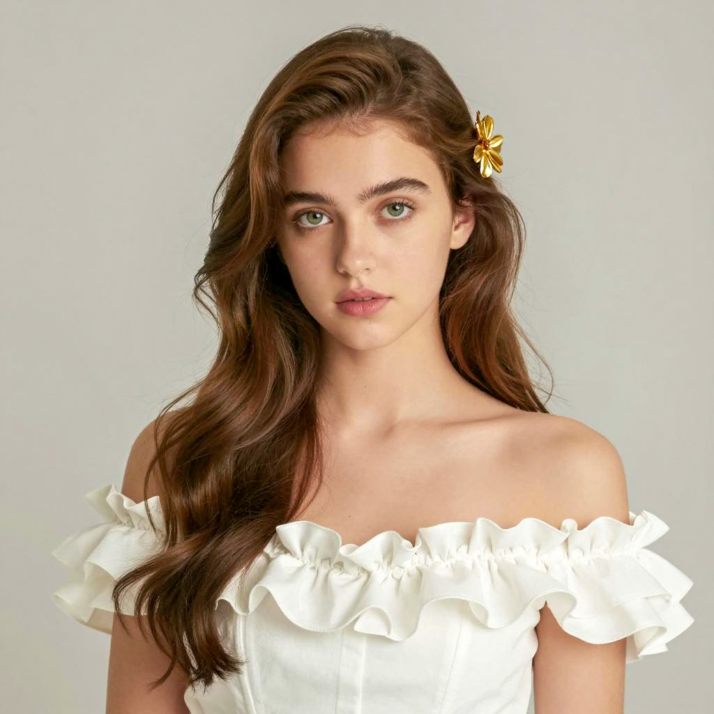 Photorealistic portrait of a young woman with brown wavy hair styled in a side braid and blue eyes. She is wearing a detailed Victorian-style red dress featuring a white lace collar with a ribbon tie. The soft sunlight illuminates her calm expression as she stands outdoors with a blurred background of beige umbrellas and a clear blue sky at the beach.