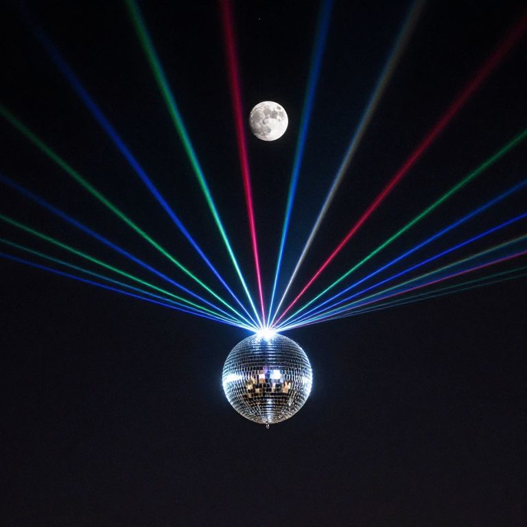 Luminous laser beams radiate outward from a celestial disco ball, transforming the moon into a vibrant spectacle against the star-studded night sky.