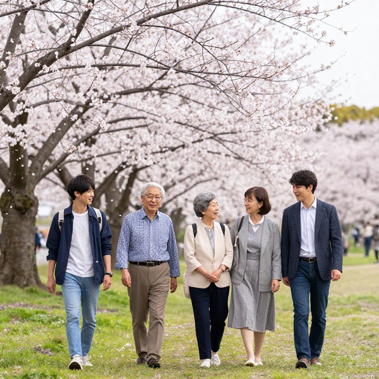 Photograph of a family picnic in a lush, green park. A young couple and their two children, dressed in casual white and light blue clothes, sit on a beige blanket. The mother with black hair tied back, and the father with short black hair, sit cross-legged while the children sit on either side. They share a colorful picnic spread with fruits and bread. In the background, a small, brown and white dog runs playfully. Tall green trees and a blooming cherry tree with white flowers frame the scene, with sunlight filtering through the leaves.