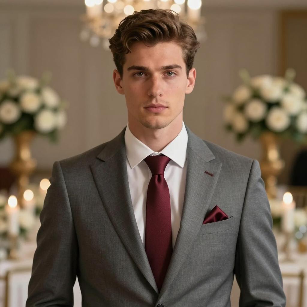Photorealistic image of a handsome young man with brown hair, wearing a brown suit, white shirt, and maroon bow tie with a matching pocket square. He stands confidently with a serious expression in a dimly lit, elegant ballroom featuring warm lighting and chandeliers. Other formally dressed guests in black suits and evening gowns are blurred in the background, creating a sophisticated and formal atmosphere.
