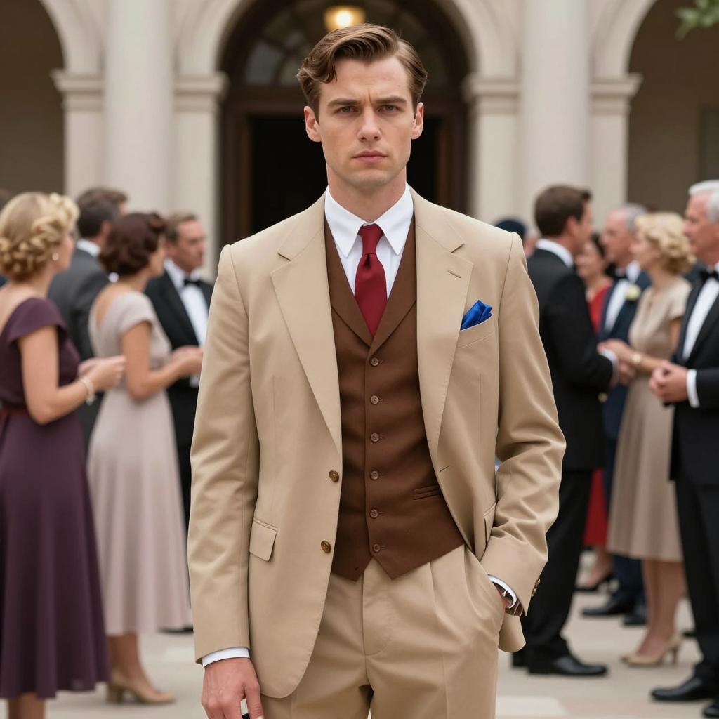 Man party attire, photorealistic, handsome man, standing, brown suit, white shirt, maroon bow tie, pocket square, brown hair, well-groomed, serious expression, dimly lit elegant ballroom, blurry background, other people in suits, warm lighting, chandeliers, sophisticated, formal attire, digital art, fashion photography style