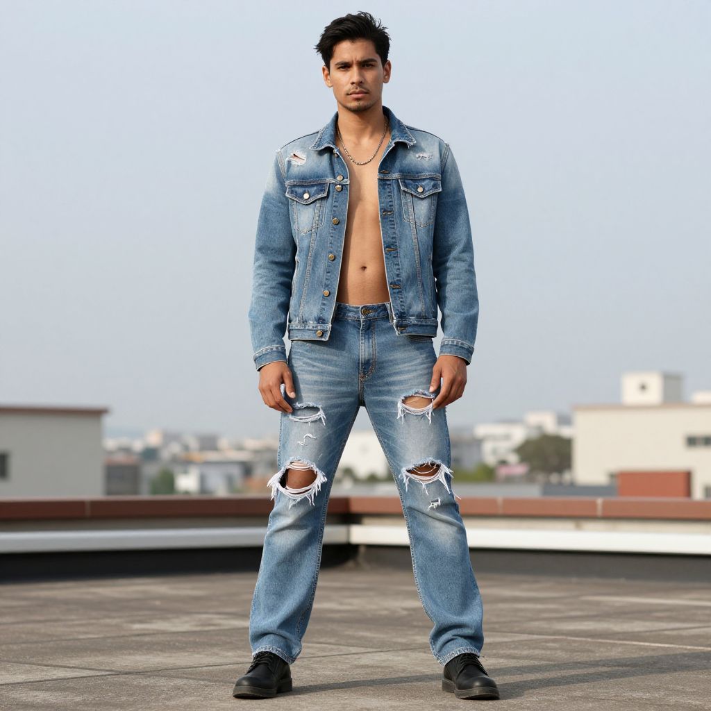 Tattered Jeans Costume, man in a denim jacket and jeans standing on a rooftop