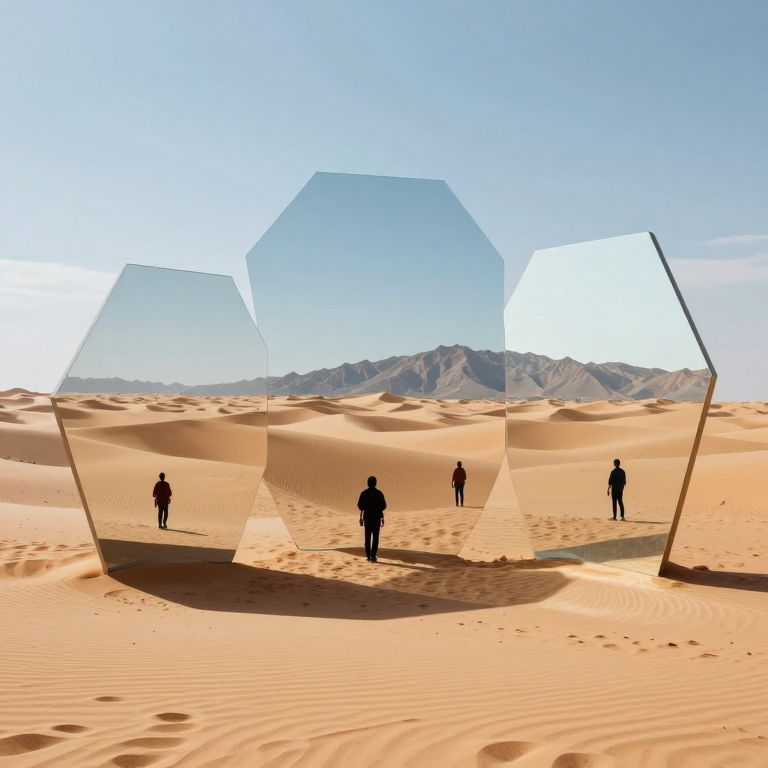 Travelers stand amidst a surreal desert landscape where three large, irregularly shaped mirrors reflect alternate realities, creating a fragmented yet cohesive scene of dunes, mountains, and mirrored figures.