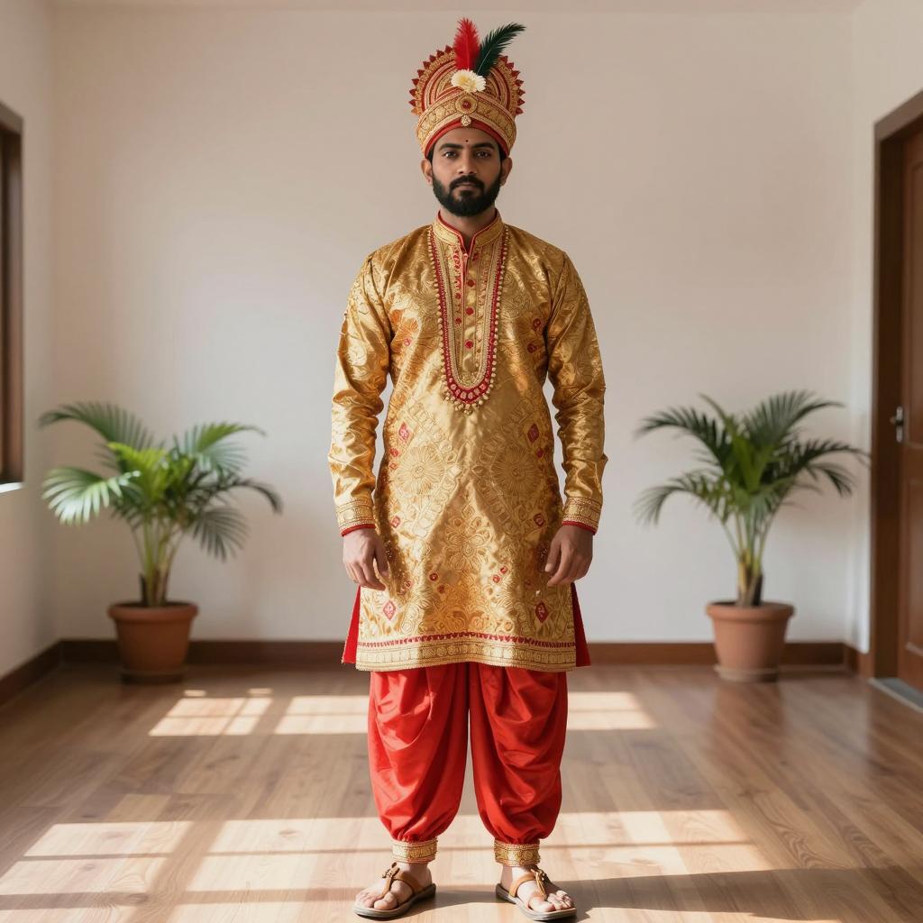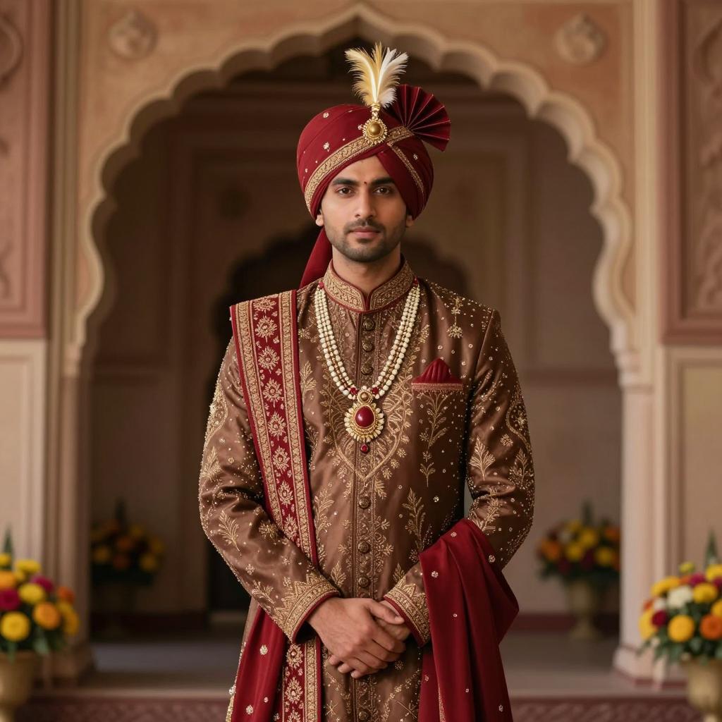 Navratri costume man, photorealistic, portrait of a handsome Indian man, traditional Sikh attire, wearing a red and gold turban with a central gem, red and turquoise dress, gold and orange sleeves, multiple gold necklaces, serious expression, neatly trimmed beard, dark skin, medium build, indoor background, warm lighting, blurred potted plant and wooden door in background, rich colors, detailed ures, cultural attire, elegant, traditional Indian fashion, close-up, upper body shot