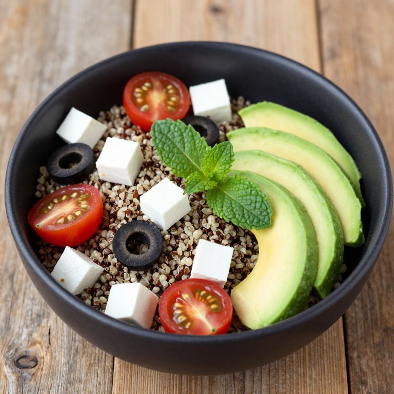 Vibrant organic quinoa salad featuring feta cheese cubes, halved cherry tomatoes, sliced avocado, black olives, and fresh mint leaves artfully arranged in a dark ceramic bowl atop a rustic wooden surface.