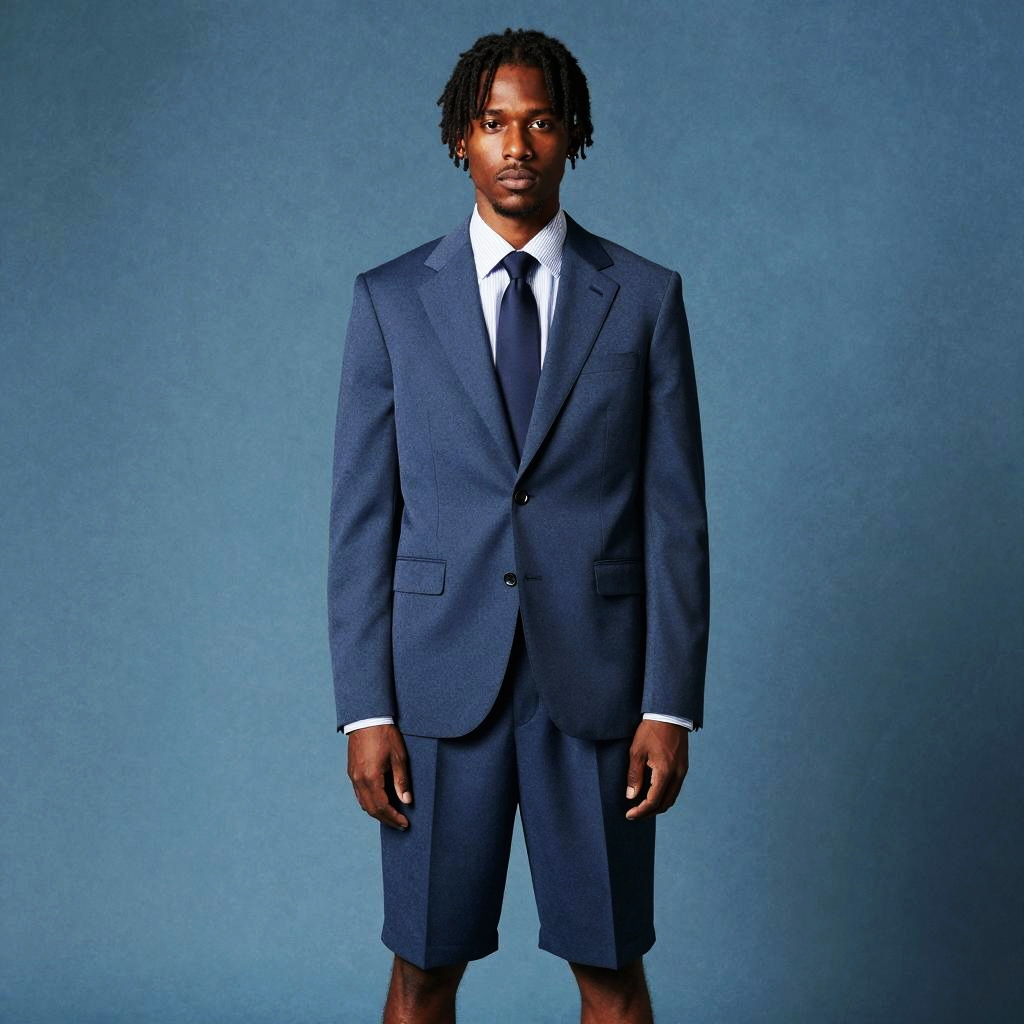 Portrait of a young Black man with dreadlocks wearing a modern blue suit that combines formal and casual styles. The suit jacket is paired with matching shorts, a striped shirt, and a dark blue tie, all set against a textured blue background.