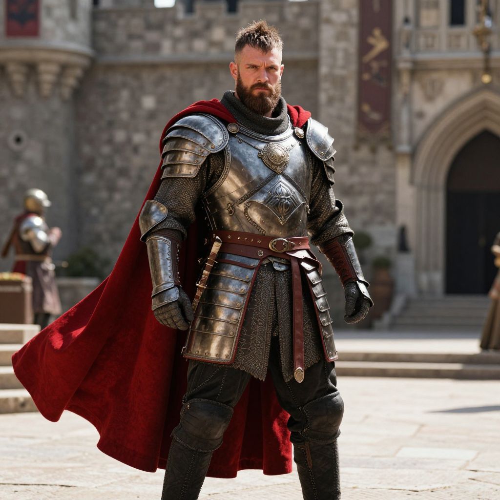 A muscular man with short, spiked hair and a thick beard wearing detailed medieval armor made of steel and leather, a vibrant red cape flowing behind him, black pants with reinforced stitching, standing in a sunlit castle courtyard, the atmosphere dramatic and epic, strong lighting highlighting the armor's intricate designs, a fierce and confident expression, the scene feels cinematic and action-packed, with a sense of power and historical grandeur, slightly exaggerated for visual impact, with a hint of fantasy elements in the background
