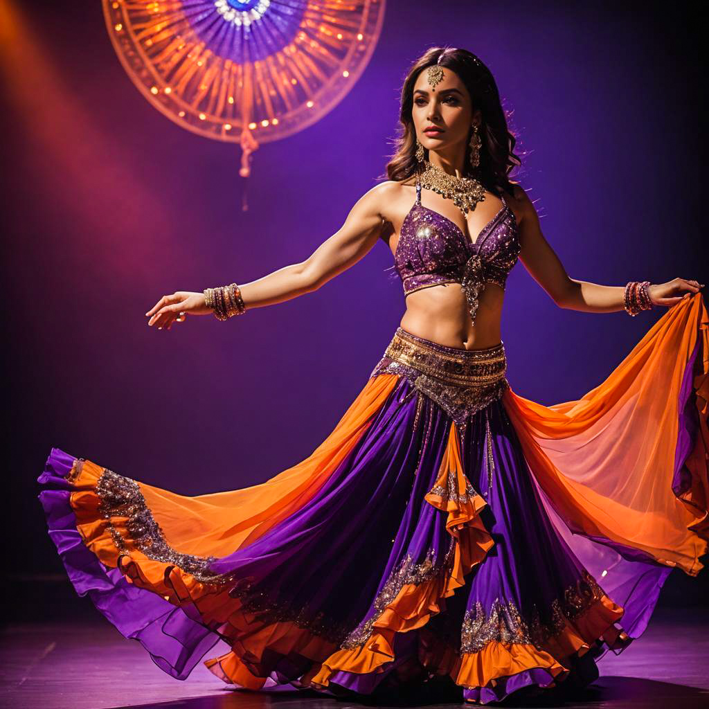 Skilled belly dancer performing on stage wearing a vibrant outfit with an embellished purple bra top and a flowing purple and orange skirt. The costume is adorned with gold detailing and jewelry, accentuated by dramatic stage lighting that highlights the dancer's graceful pose and attire.