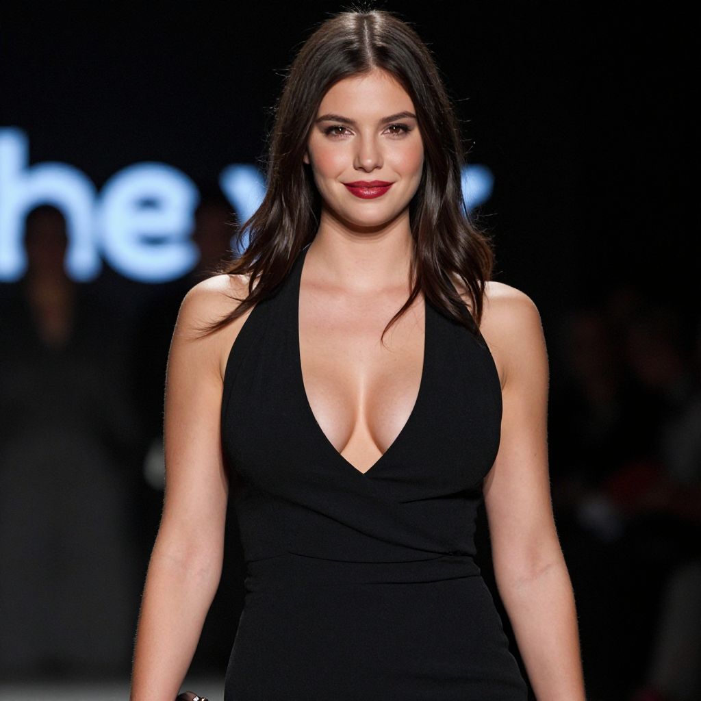 Photograph of a confident woman with long, dark brown hair and fair skin, standing on a fashion runway. She is wearing a sleeveless, deep V-neck black dress that accentuates her cleavage. Her makeup is bold, with red lipstick and defined eyebrows. The background is dark with blurred, white illuminated letters. The lighting highlights her face and dress, creating a stark contrast. She is looking directly at the camera with a slight smile. The overall style is modern and chic.