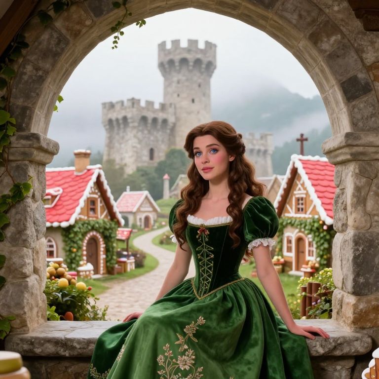 A graceful, rosy-cheeked fairy tale character with long wavy brown hair and vivid blue eyes sits on a stone bench under a towering castle archway, dressed in a velvet corset and embroidered green skirt. The setting is a misty countryside village with cottages made of gingerbread and red roofs, with ivy-covered walls and a winding path leading into the distant mountains.