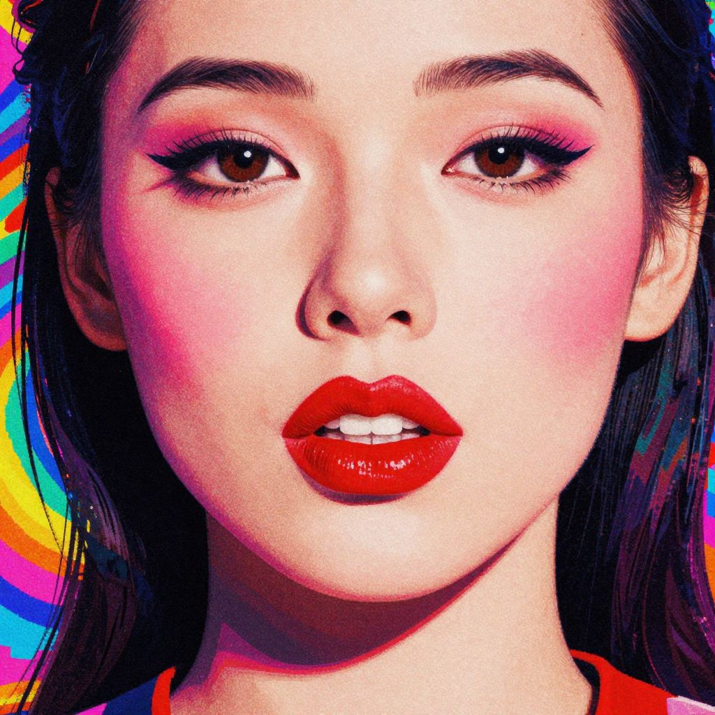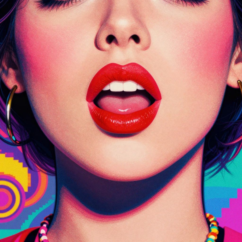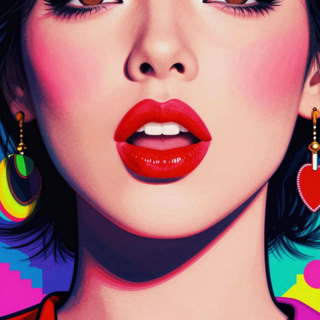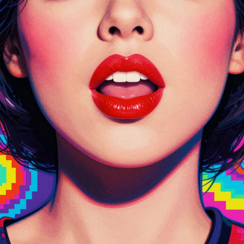 Close-up digital artwork of an Asian woman's face, focusing on her glossy red lips slightly parted, with vibrant, pixelated background.