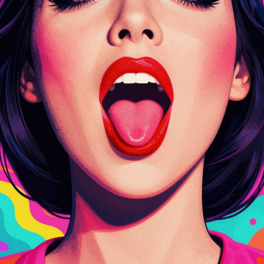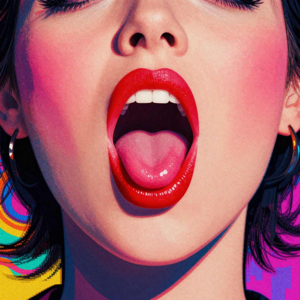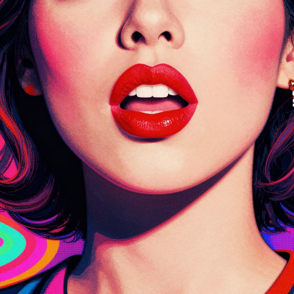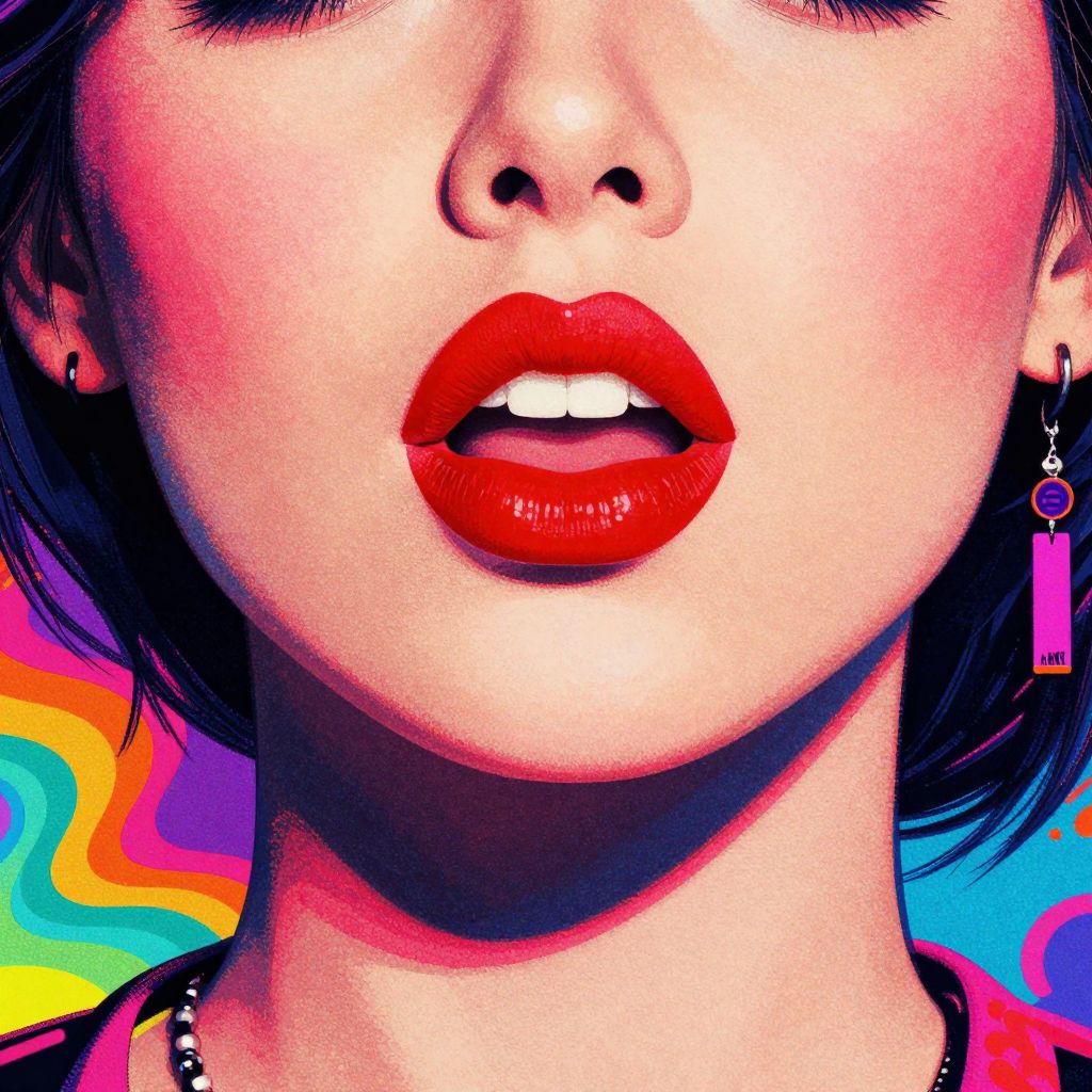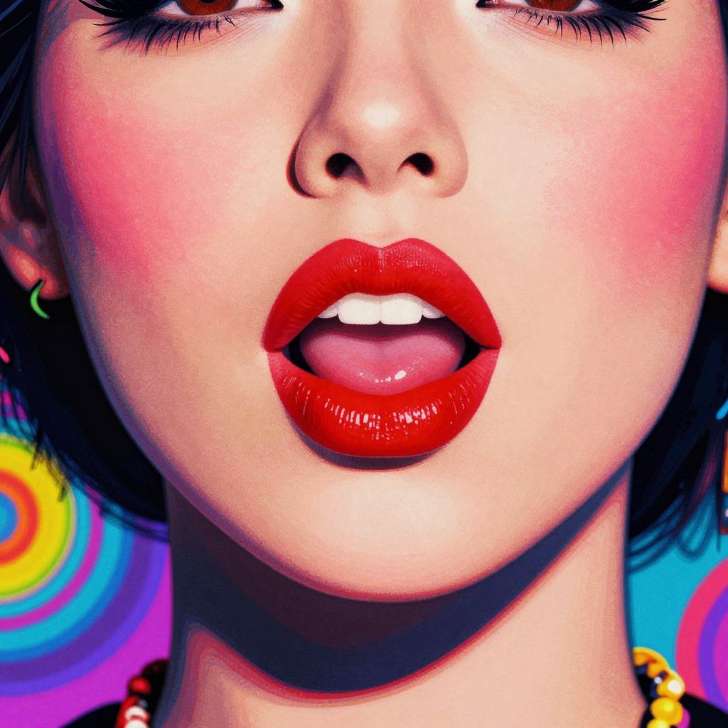 Close-up digital artwork of an Asian woman's face, focusing on her glossy red lips slightly parted, with vibrant, pixelated background.