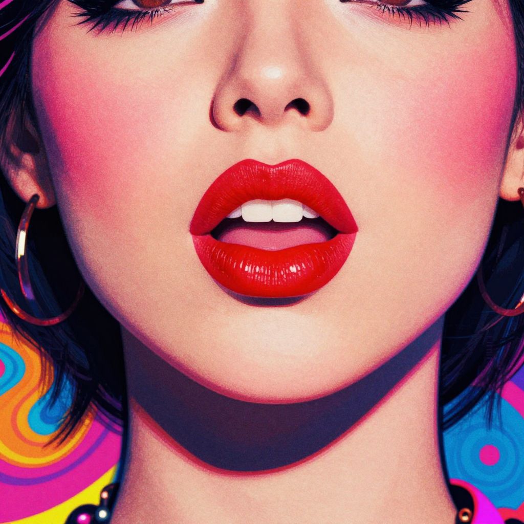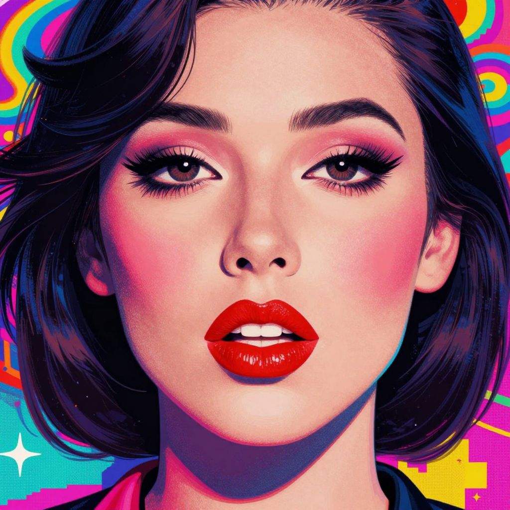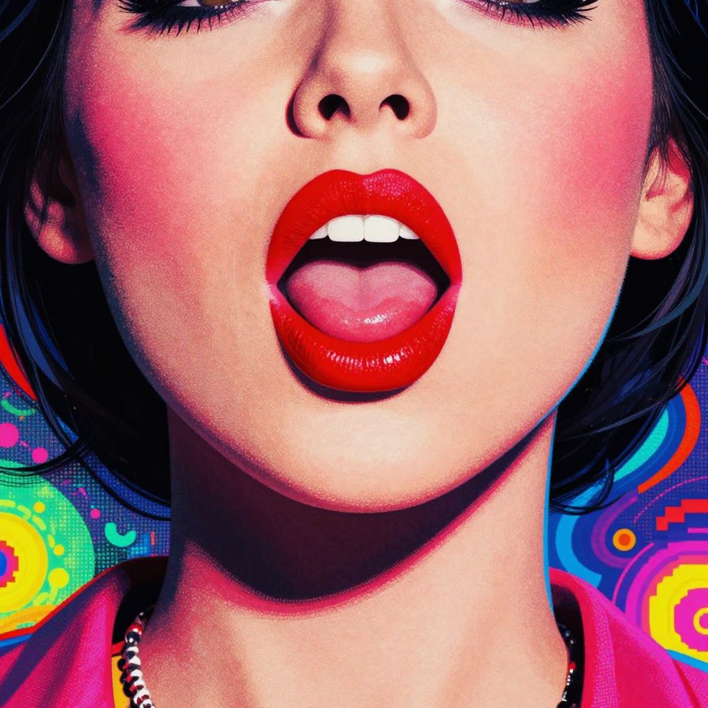 A vibrant pop-art inspired illustration featuring a woman with bold red lips and rosy cheeks, set against a psychedelic background with a pixelated texture, evoking a retro and energetic aesthetic reminiscent of band album artwork.