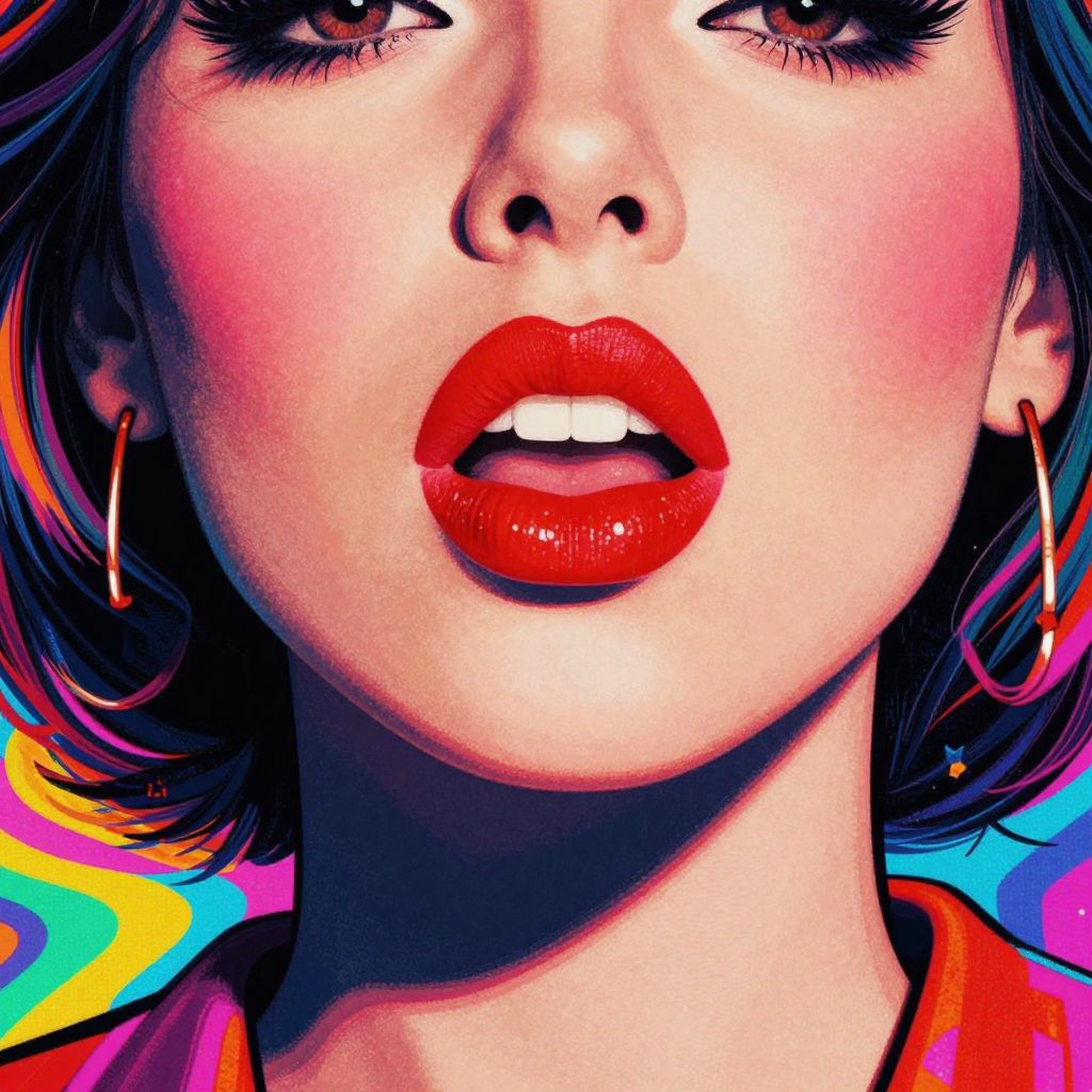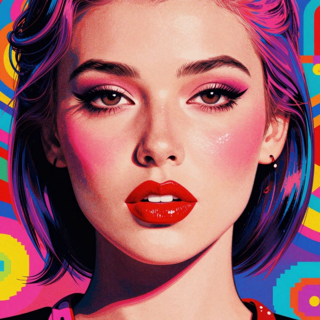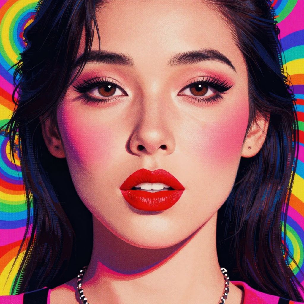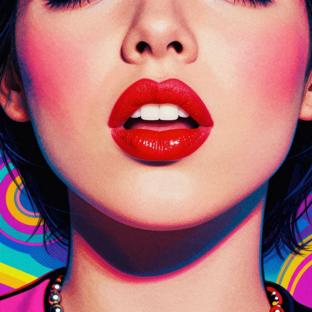 A vibrant pop-art inspired illustration featuring a woman with bold red lips and rosy cheeks, set against a psychedelic background with a pixelated texture, evoking a retro and energetic aesthetic reminiscent of band album artwork.