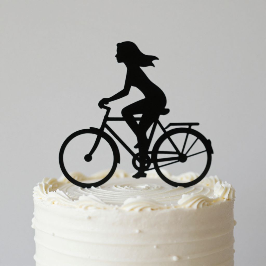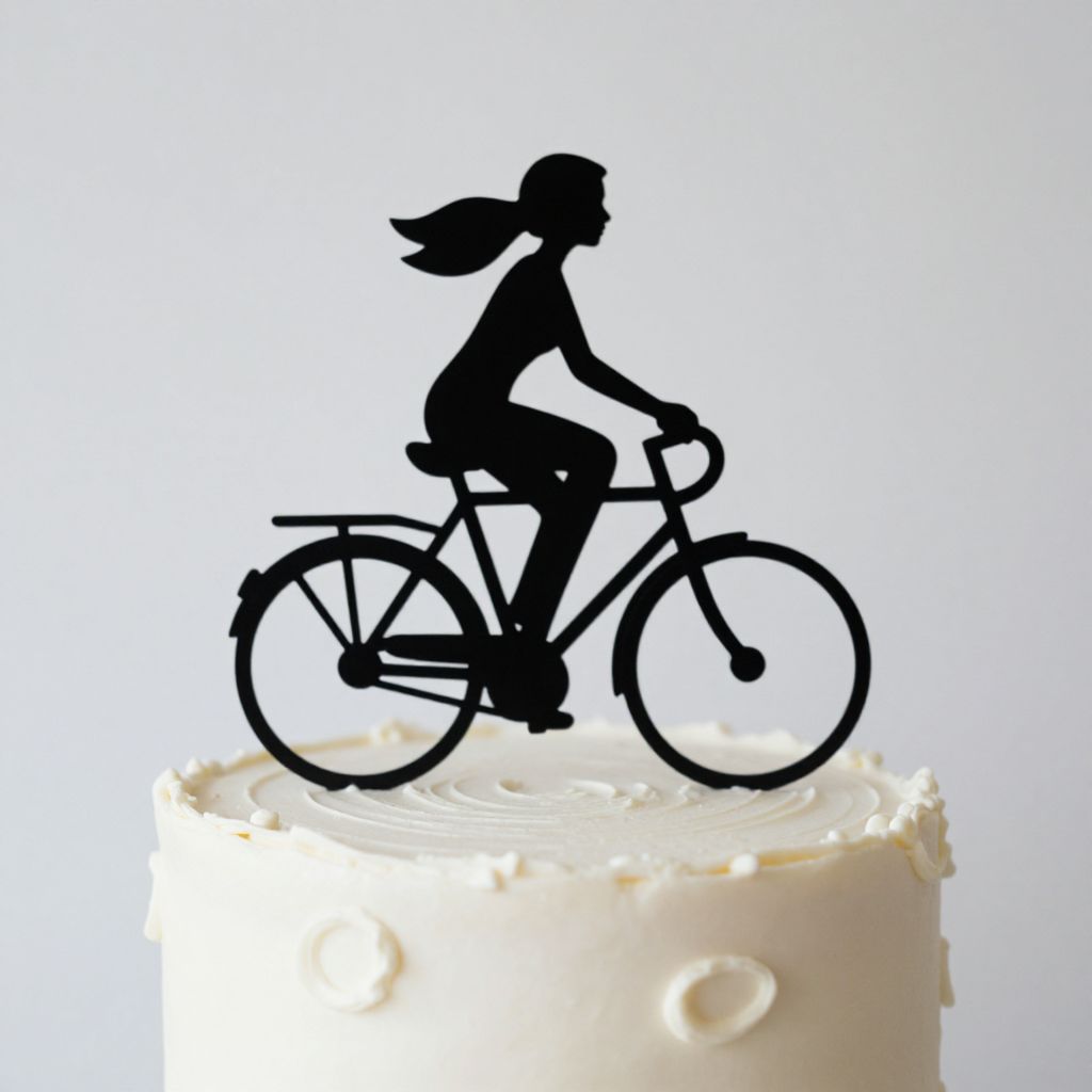 A sleek black silhouette of a woman riding a bicycle, crafted in a minimalist and modern artistic style, serves as a custom cake topper atop a pristine white frosted cake with delicate swirls, showcasing a blend of elegance and creativity by Silhouetteweddings.