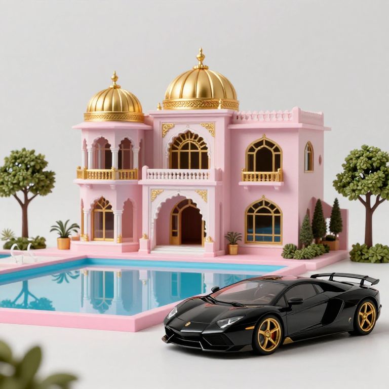 Photorealistic CGI image of a pink, golden-domed mansion with arched windows, beside a blue pool, and a sleek black sports car with