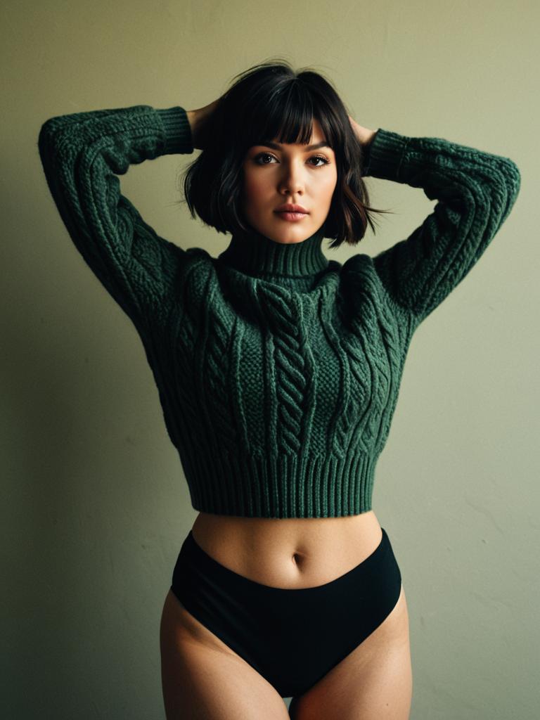 Woman wearing chunky cable-knit turtleneck sweater lifted to reveal toned midriff and simple low-rise bikini briefs in forest green on dark-haired woman with short tousled bob posed standing with one arm bent behind her head and the other resting on her hip in minimal studio with plain warm-toned wall, single side light creating sculpted contrast, artistic editorial fashion photography, high resolution, ultra-detailed, 1girl, underboob, big brasts
