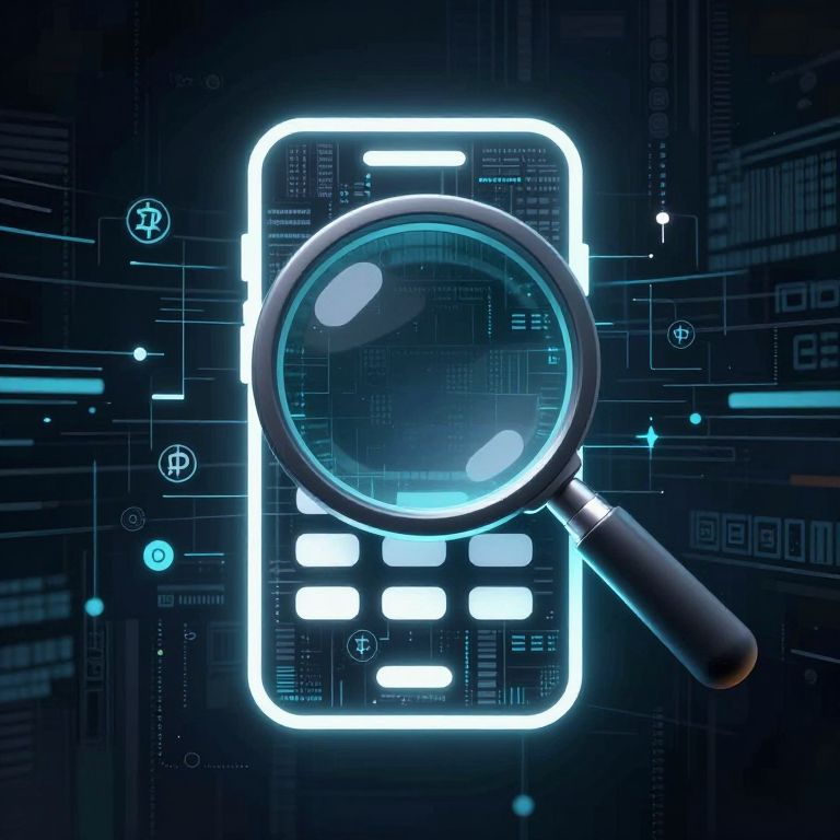 Freephonelookup graphic, stylized magnifying glass over mobile phone icon surrounded by data streams and cryptographic symbols, glowing edges, dark mode cyber theme, intricate digital patterns, high detail, modern technology illustration