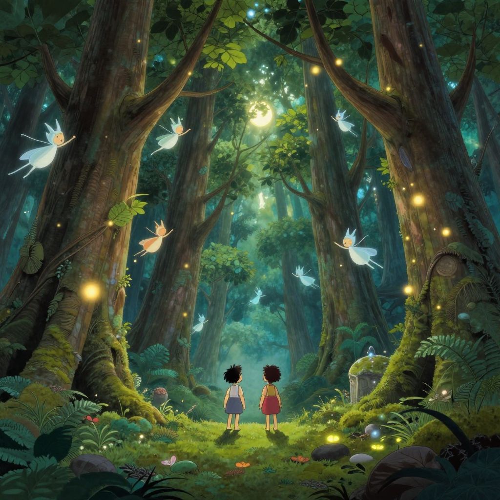 An enchanting digital artwork fuses the captivating storybook visuals reminiscent of Studio Ghibli's cinematic magic with the whimsical charm of Dr. Seuss, creating an expansive, colorful landscape brimming with peculiar creatures and fantastical elements from a child's perspective. As one traverses this imaginative world through the magical doorway of a wardrobe, they are immersed in a realm that evokes a spectrum of emotions, ranging from wonder to nostalgia, harmoniously blending captivating visuals with the ethereal essence of Studio Ghibli's masterpieces.