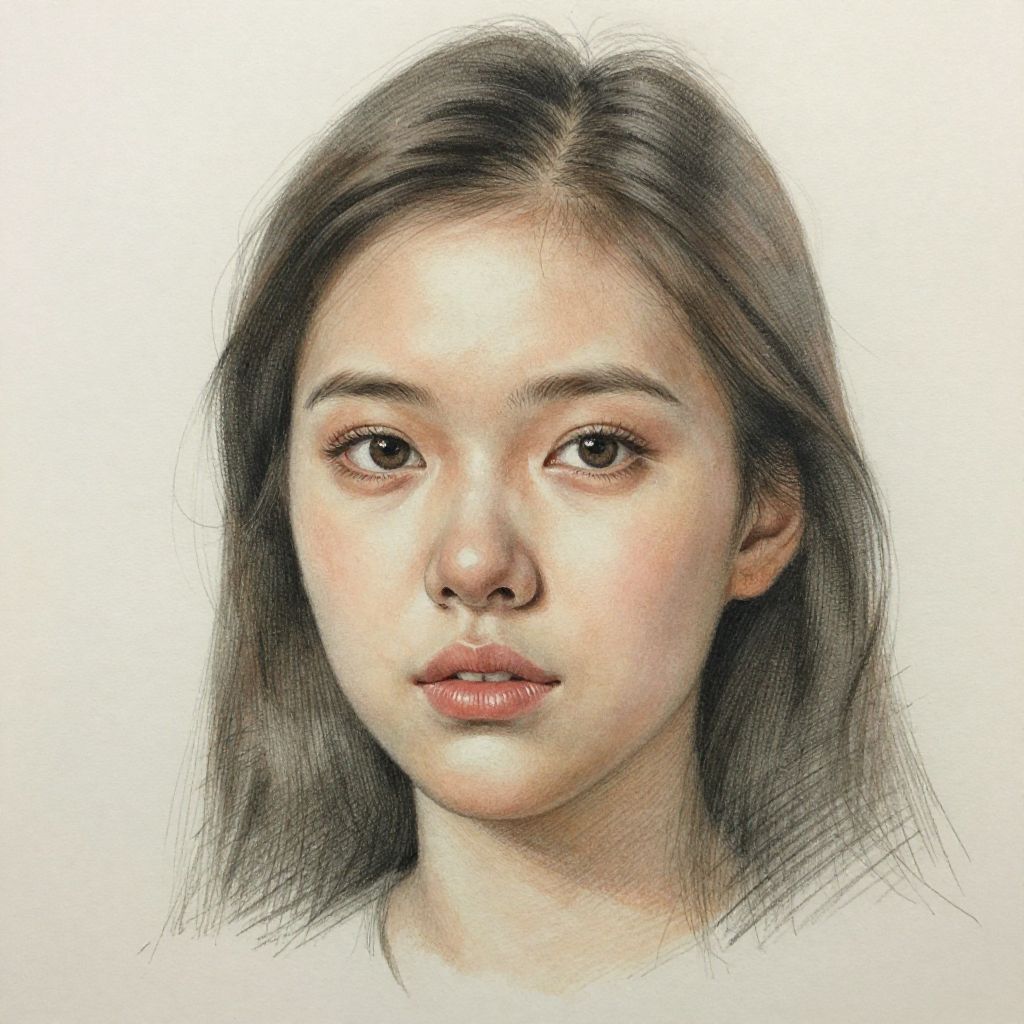 This is a highly detailed, realistic digital drawing of an East Asian woman with fair skin and medium-length, straight, dark brown hair. She has large, almond-shaped brown eyes, a small, straight nose, and full, pink lips. Her expression is neutral and slightly serious. The background is a plain, white gradient, which makes her face the focal point. The artist uses fine, textured lines to create a lifelike appearance, with subtle shading and highlights that give depth to her facial features. The overall style is hyper-realistic, emphasizing natural beauty and subtle details.
