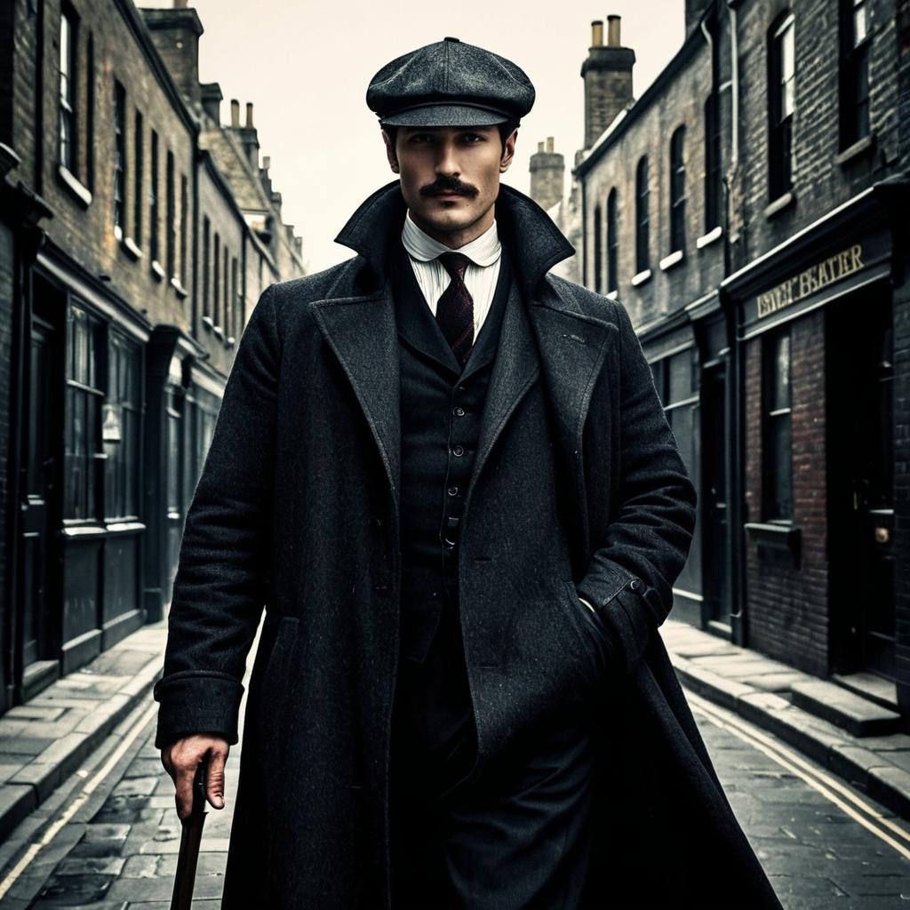 A man dressed as a medieval stablehand stands in the doorway of a rustic stable with wooden stalls and a hayloft above. He wears a long black coat, a black vest, white shirt, black tie, and a black hat. The stable features high wooden rafters, a stone floor with straw scattered, and warm, soft lighting creating an enchanting and magical atmosphere.