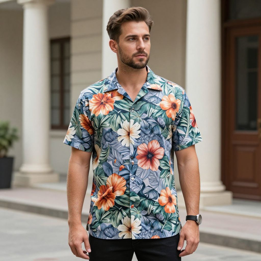 Printed Shirt Costume, man in a floral shirt standing in front of a building