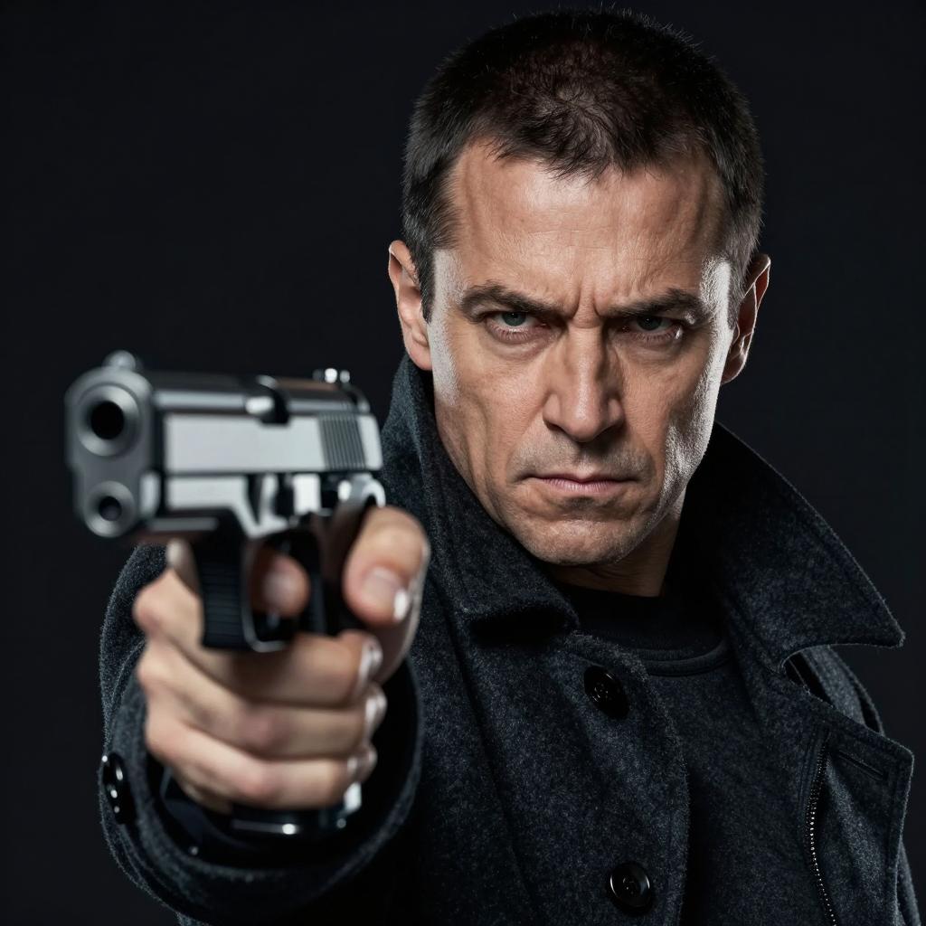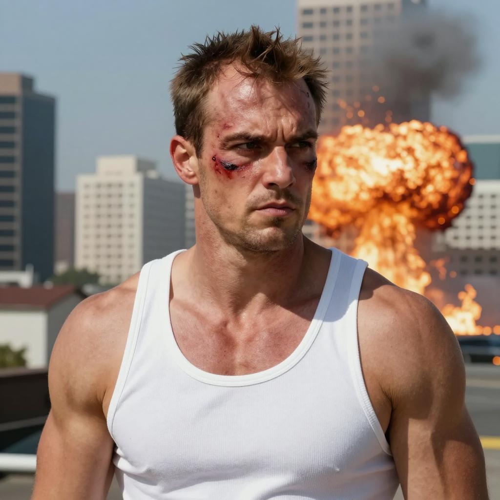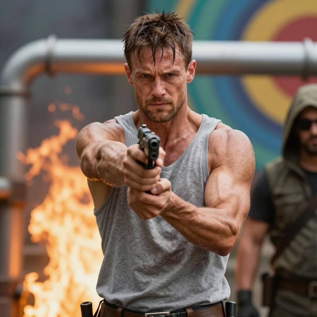 A muscular, middle-aged man with a serious expression, holding a black handgun to his right temple. He has green eyes, short dark hair, and a stitched forehead wound. Background has a ured yellow and orange gradient. He wears a white tank top. One eye is partially shadowed, adding intensity. The man's right hand is visible, gripping the gun. The image focuses on the man's face and gun.