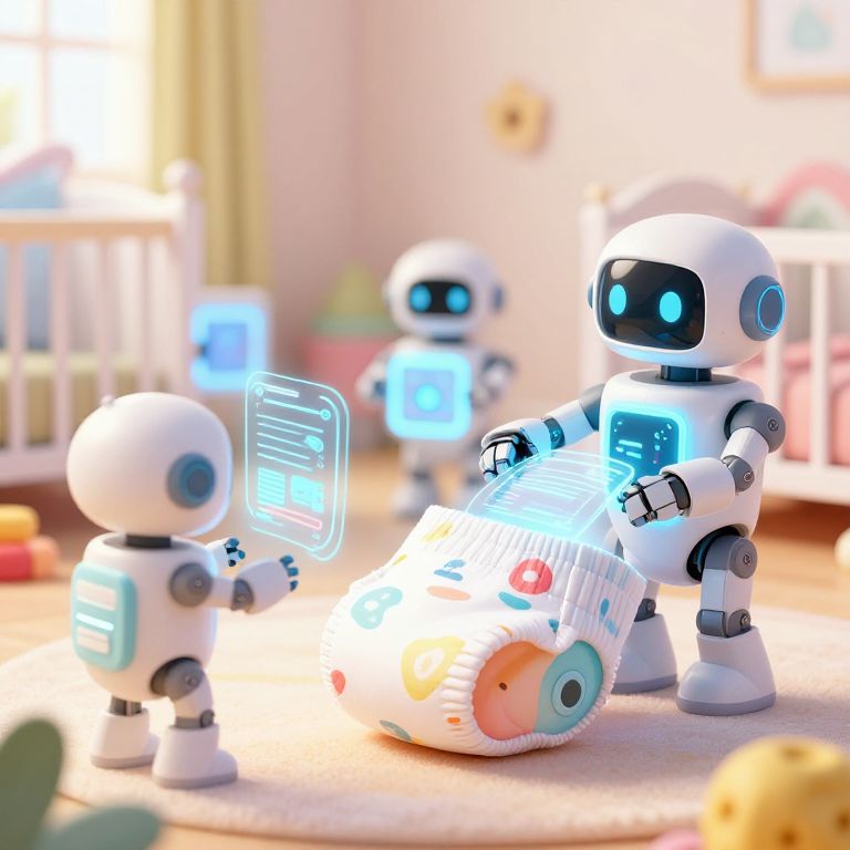 AI diaper art depicting a whimsical nursery scene where robots craft colorful, patterned diapers powered by artificial intelligence, with glowing panels and dynamic holographic textures, rendered in a bright, playful, cartoonish visualization.