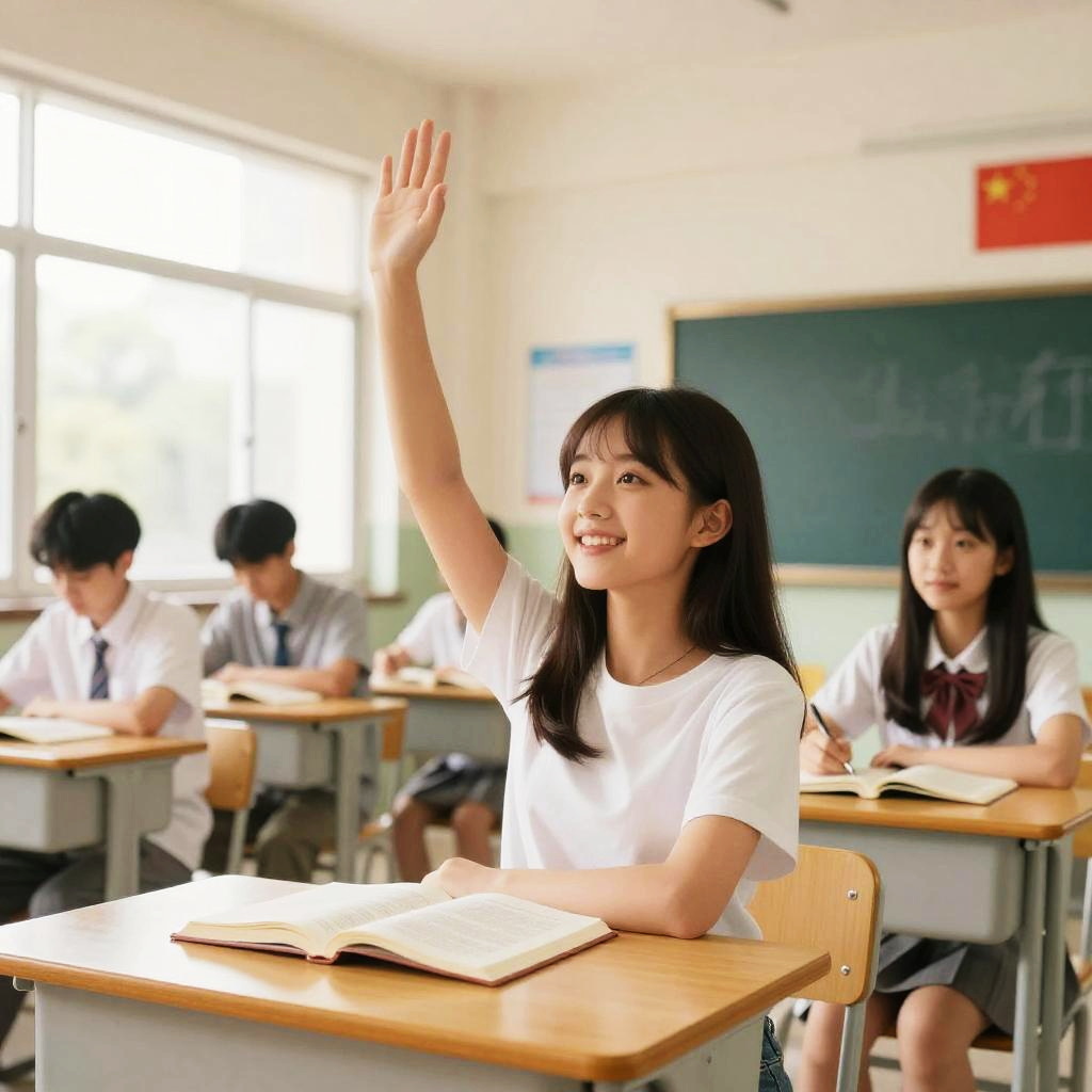 Photograph of a bright classroom with sunlight streaming through large windows. In the foreground, an Asian girl with long black hair, wearing a white T-shirt and grey skirt, raises her right hand enthusiastically. She sits at a wooden desk with an open book. In the background, three other Asian students, also wearing white shirts and grey skirts, sit at their desks, focused on their books. A green chalkboard with faint writing is on the back wall, and a small red banner is visible above it. The classroom is tidy and well-lit.