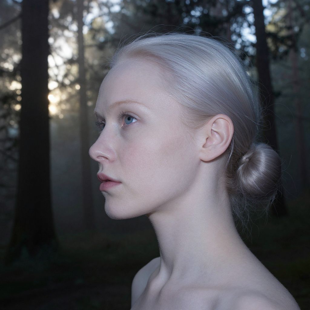 Imagine a portrait photograph, captured with a digital camera, of a Pacific Islander woman with porcelain skin, icy blue eyes, and silver-white hair swept back into a low bun. This hyperrealistic image showcases her enigmatic charm from a unique 'sideways' angle, emphasizing the sculptural beauty of her profile and the delicate texture of her fair complexion. Illuminated by the soft light of twilight filtering through ancient evergreens, the composition captures an ethereal ambiance, invoking a spectrum of emotions ranging from tranquility to intrigue. The woman seems to emerge from the misty forest, her presence subtle yet powerful, drawing viewers in and enticing them to unravel the mysteries hidden within her captivating gaze.