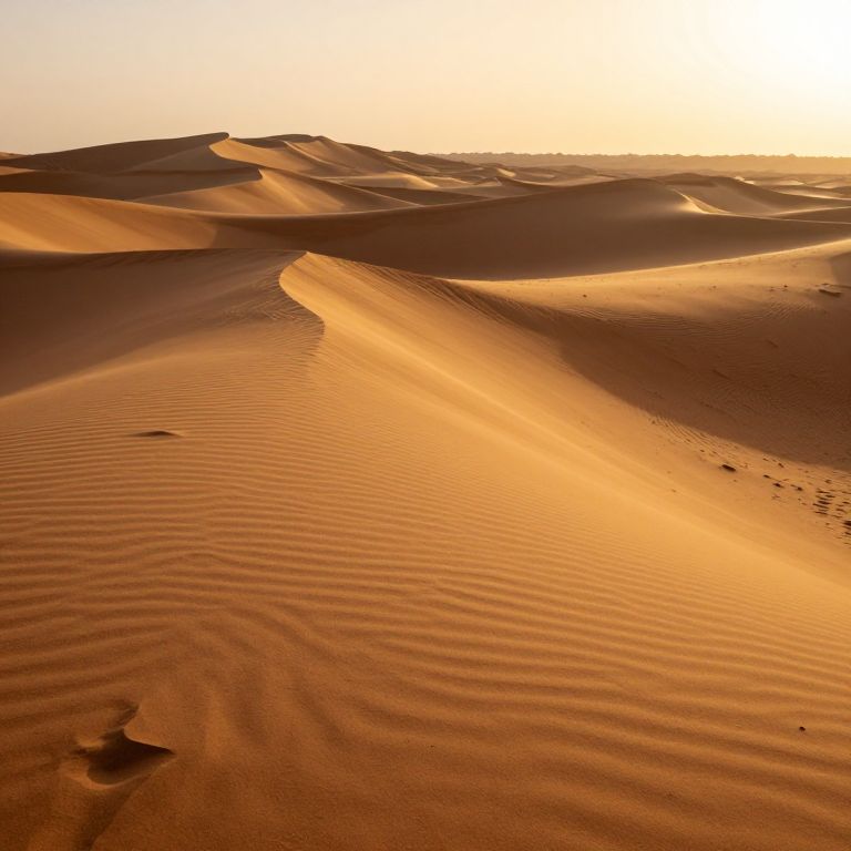 Golden-hour lighting bathes the undulating desert dunes in warm hues, creating a surreal, almost liquid-like texture as the wind carves intricate patterns across the sand, evoking the whispers of ancient landscapes and forgotten empires.