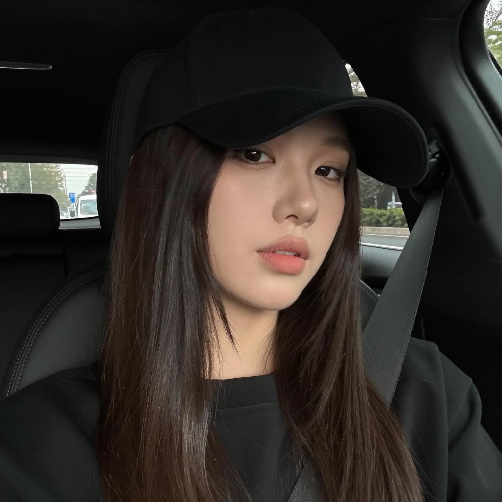 Asian woman in car, wearing black baseball cap, long straight brown hair, black top, slightly blurred, face partially shadowed, lips slightly parted, dark interior background, headrest visible behind her.