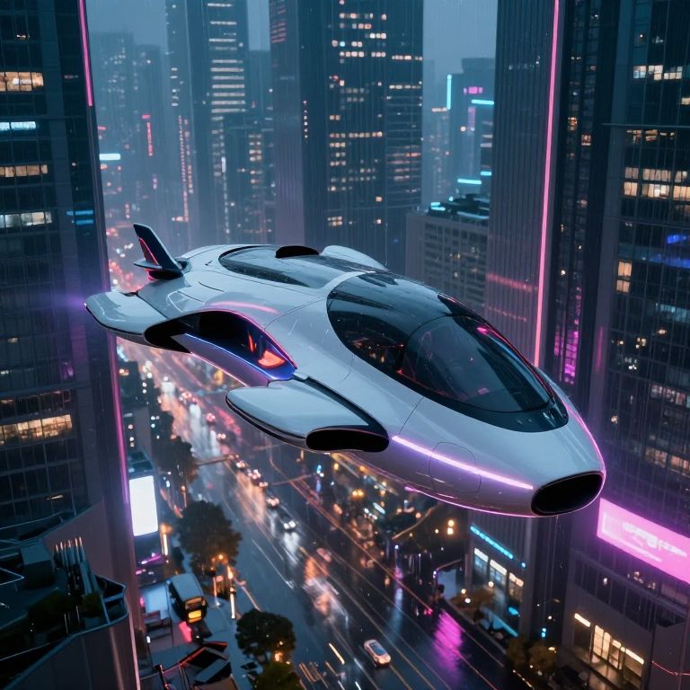 Biconic flying vehicle suspended over a cyberpunk cityscape at night, neon lights reflecting on smooth surfaces, rain-soaked streets below and towering skyscrapers, blending futuristic architecture with advanced transportation design