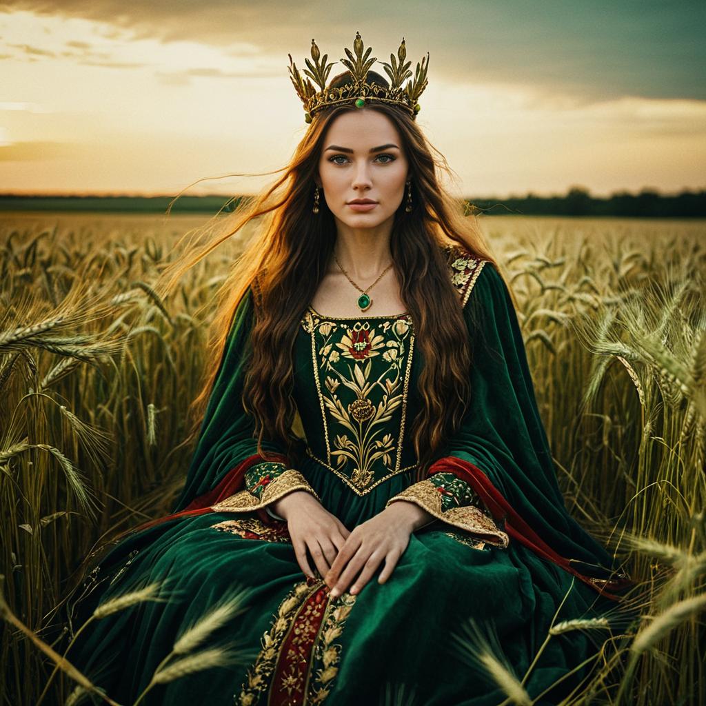 Fantasy portrait of a woman with long flowing hair, striking green eyes, and an ornate golden crown made of wheat and flowers. She is wearing a richly embroidered dark green and red medieval-inspired velvet dress with intricate gold detailing. The subject is seated in a golden wheat field under soft, warm dusk lighting, creating an ethereal and dramatic mood with painterly texture.