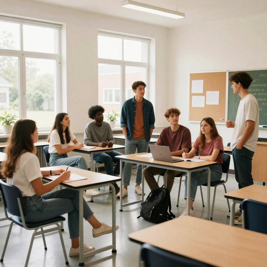 A group of young people casually sitting and standing in a bright classroom, natural lighting from large windows, relaxed and informal interaction, mixed gender and ethnicity, modern classroom setting with desks and chairs, bulletin board on the wall, daytime