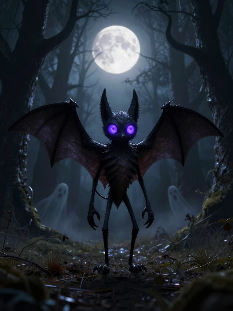 Spooky stylized bat character standing upright in the center of a dark eerie forest clearing at night, huge glowing soft violet eyes staring at the viewer, long skinny limbs and slightly exaggerated proportions, surrounded by twisted trees and faint ghostly silhouettes, dusty haze between the trees filling the air, full moon glowing in the background, cinematic wide-angle shot, dark whimsical gothic fantasy style, highly detailed 3d illustration, soft volumetric pale silver glow, high resolution